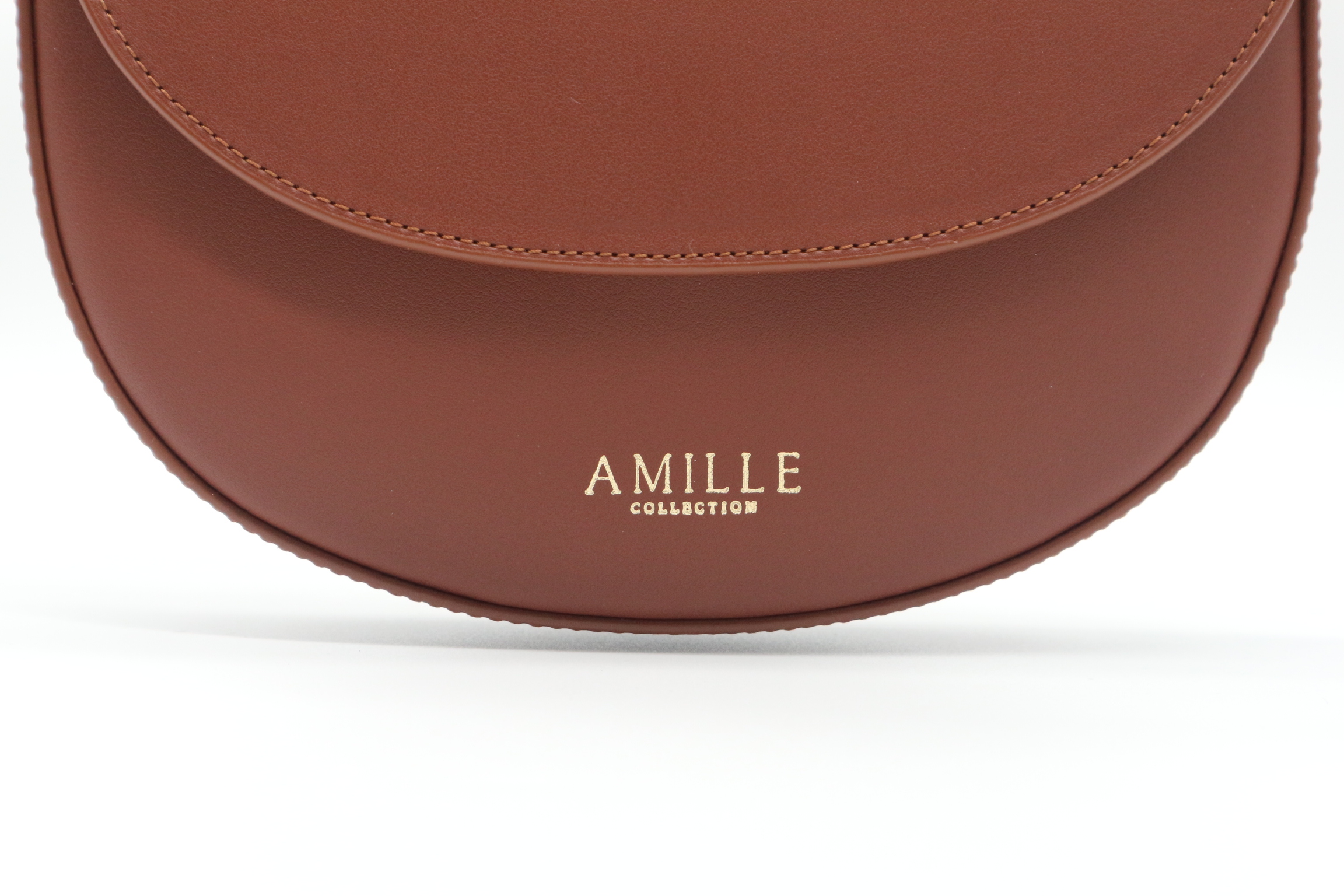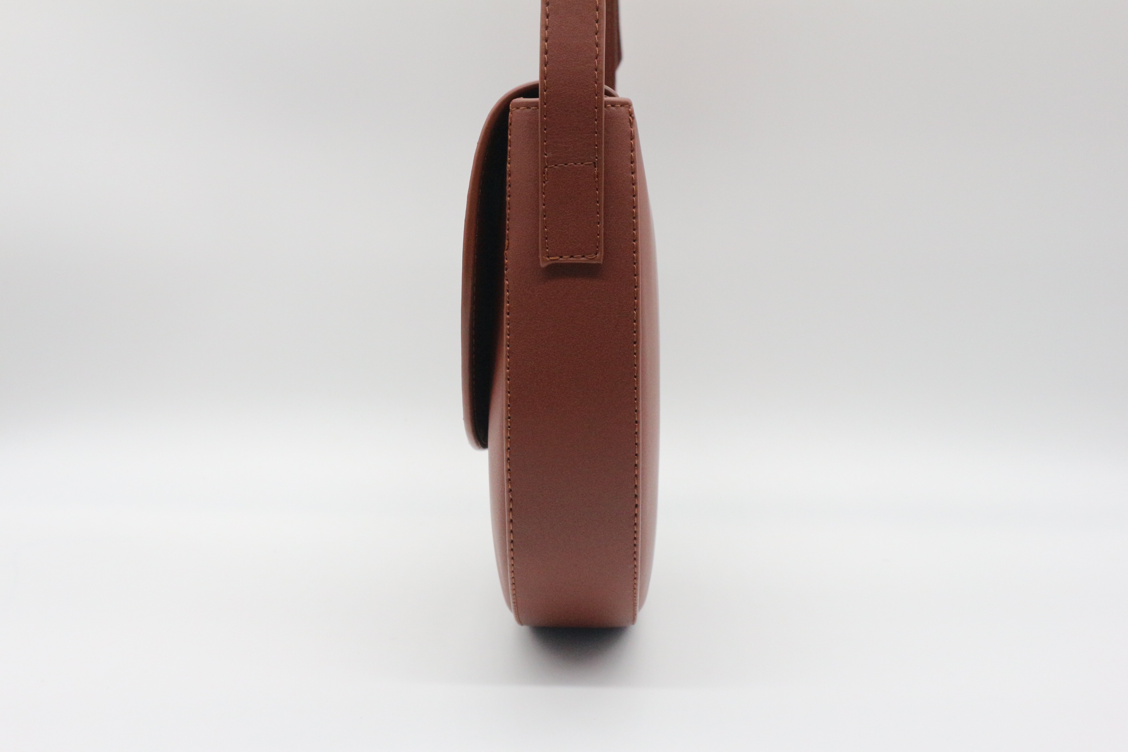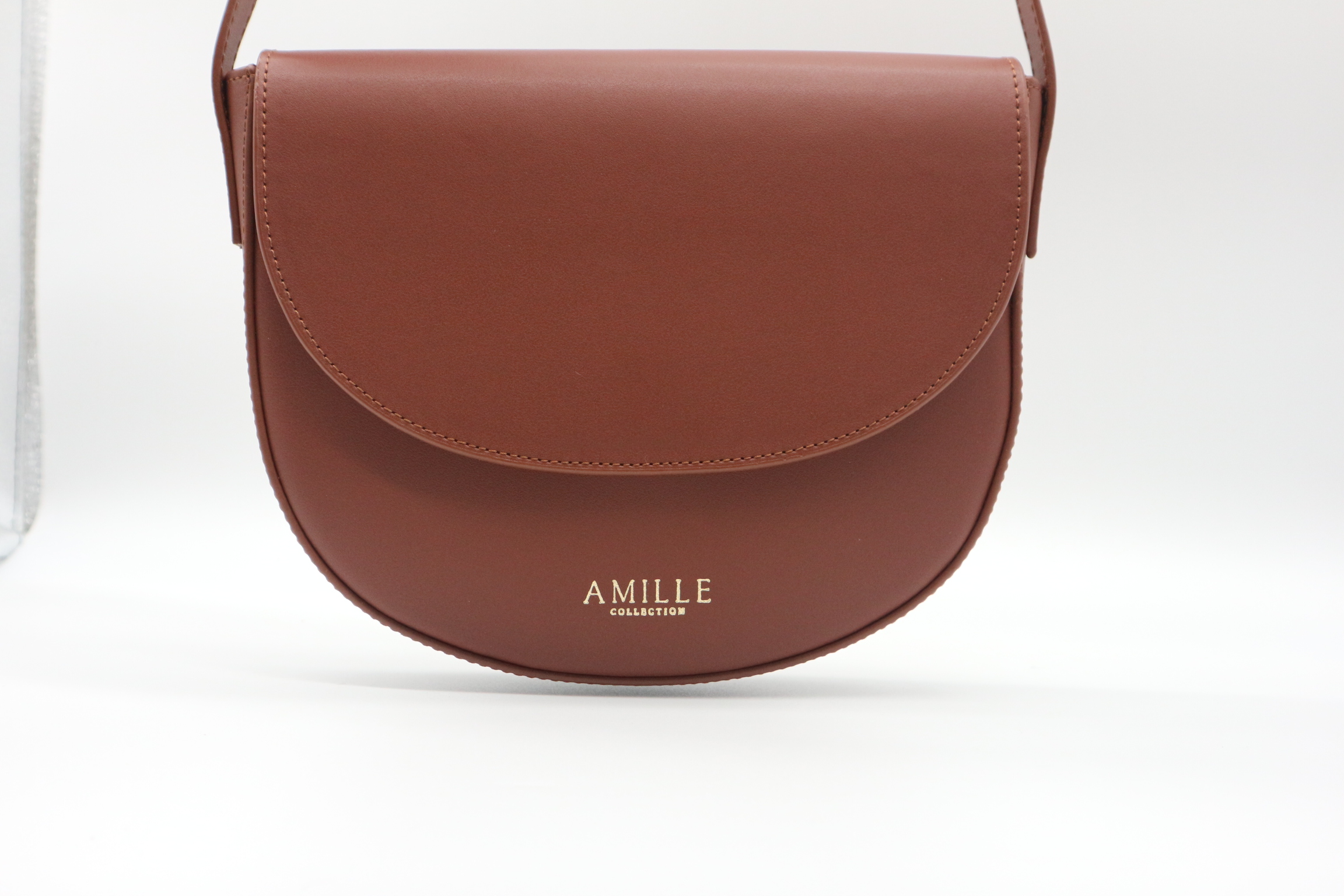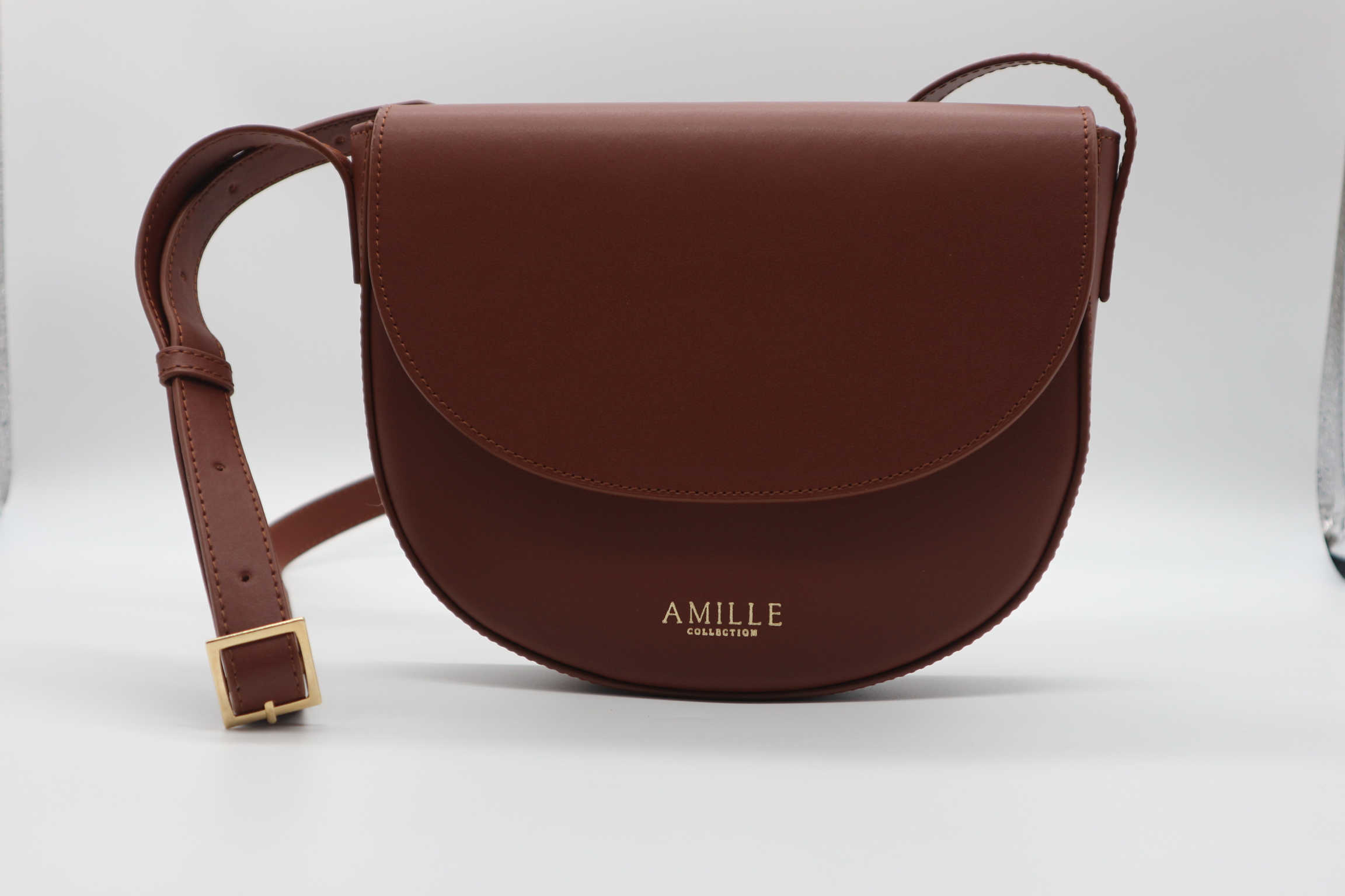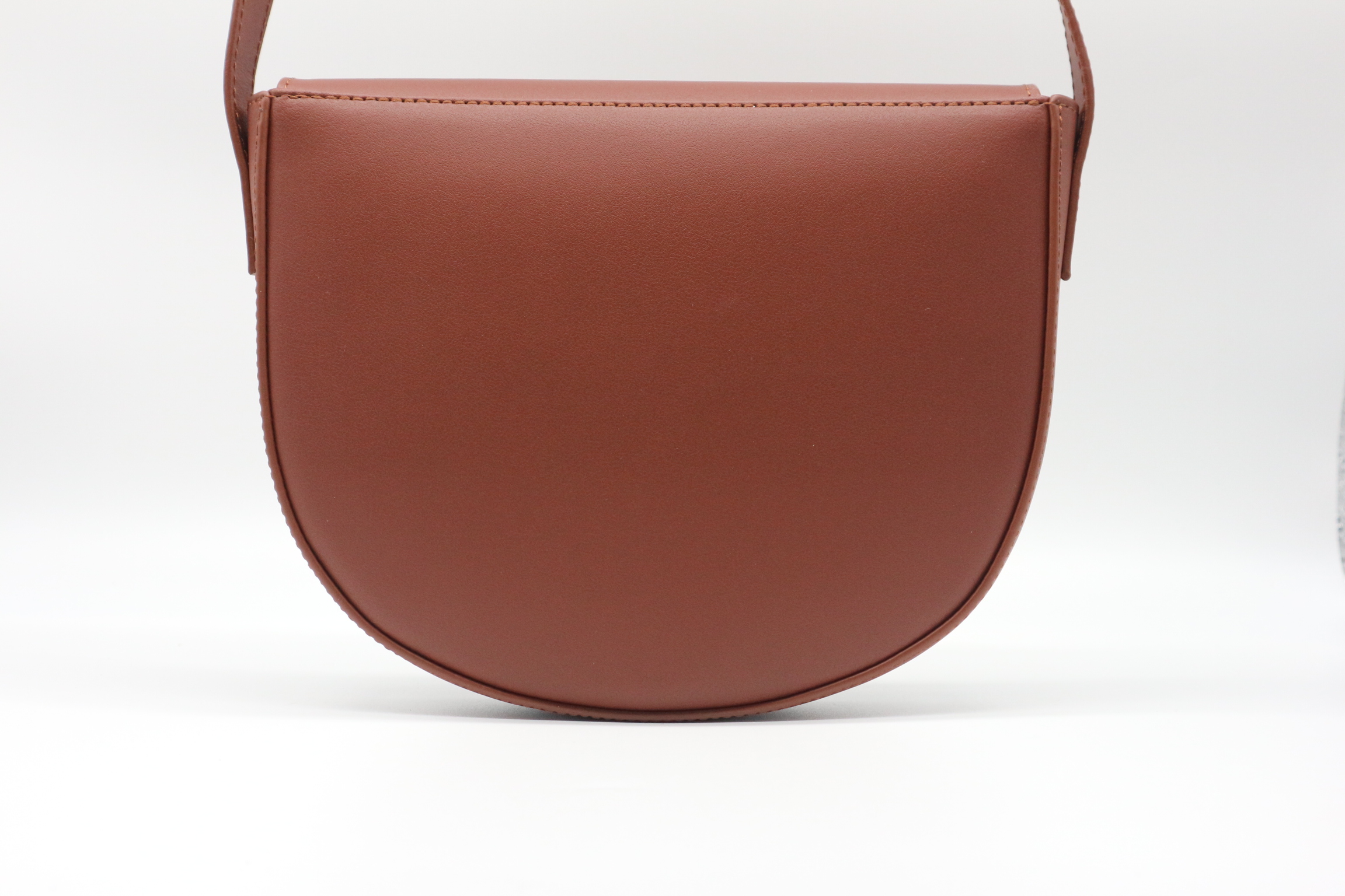 Bolso de color marrón chocolate con forma semicircular de piel vacuna.