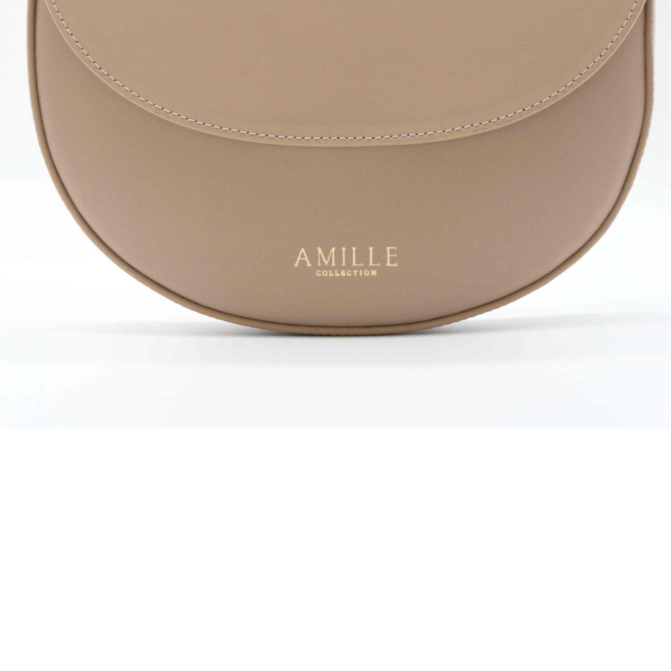 Bolso de color taupe con forma semicircular de piel vacuna.