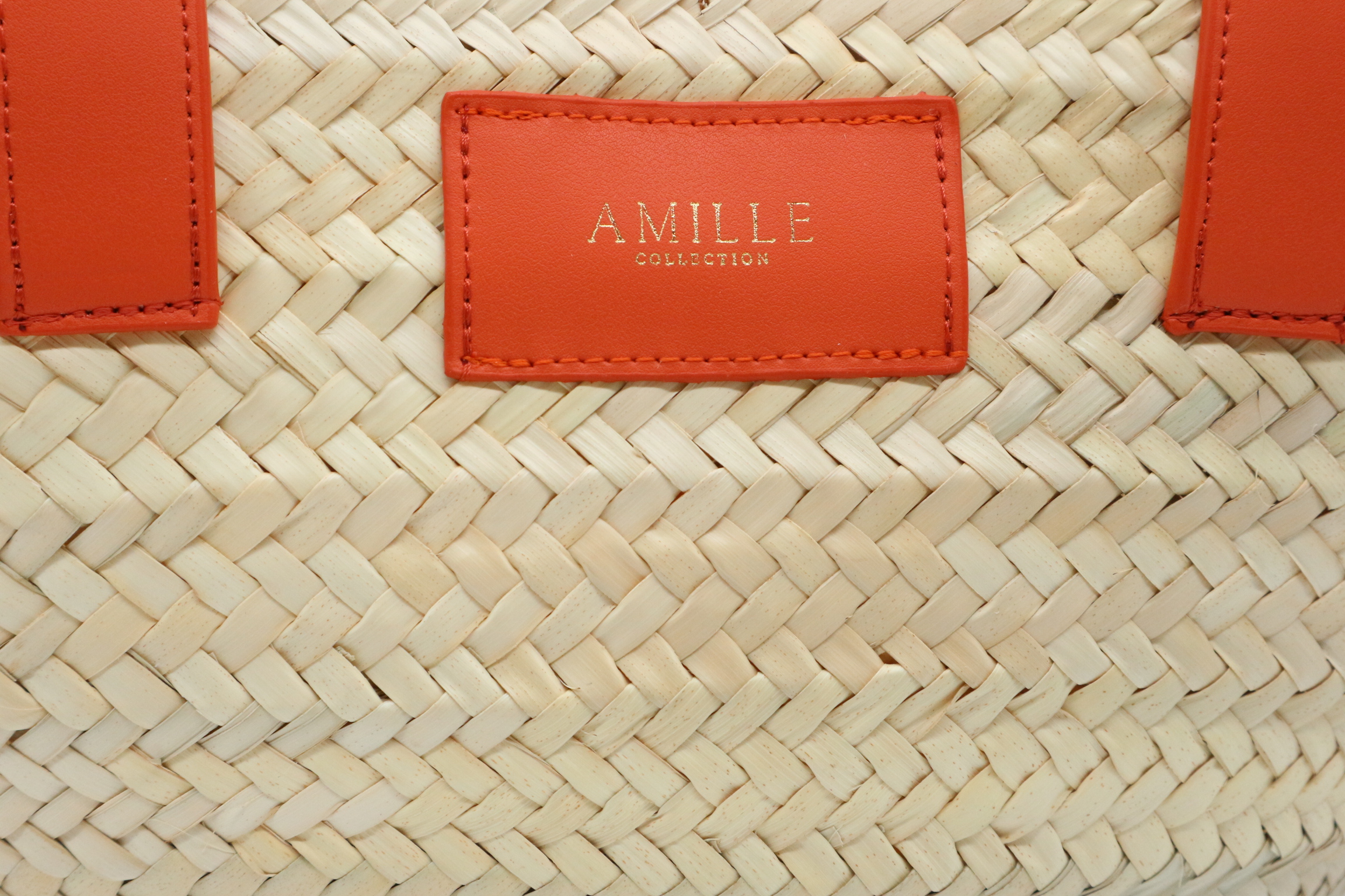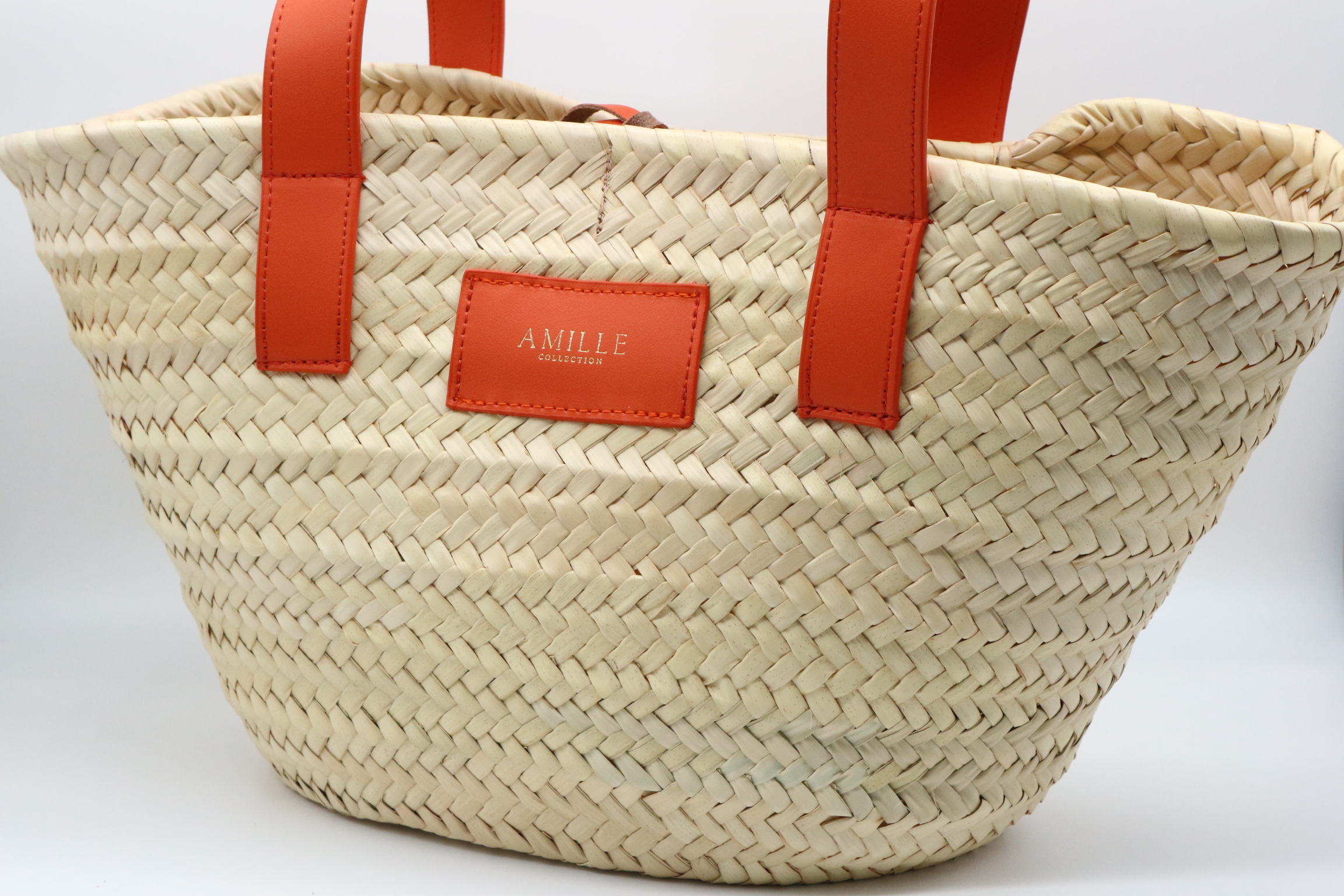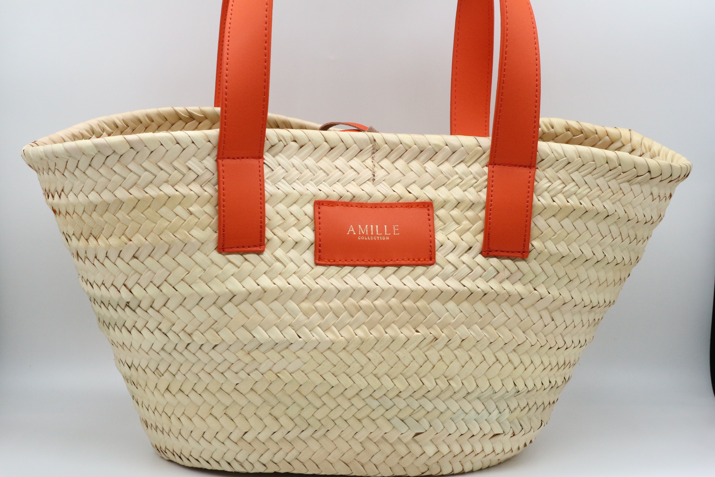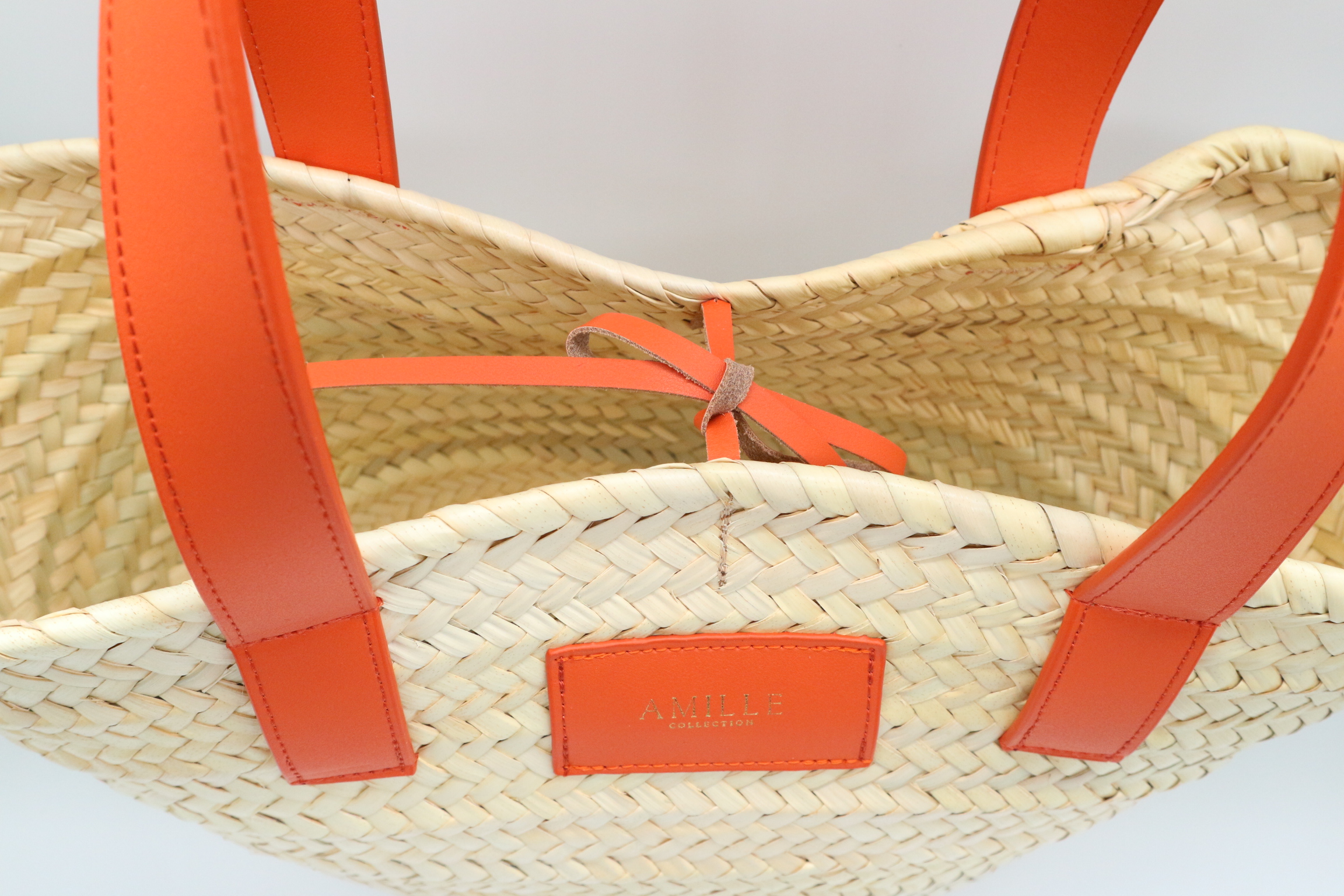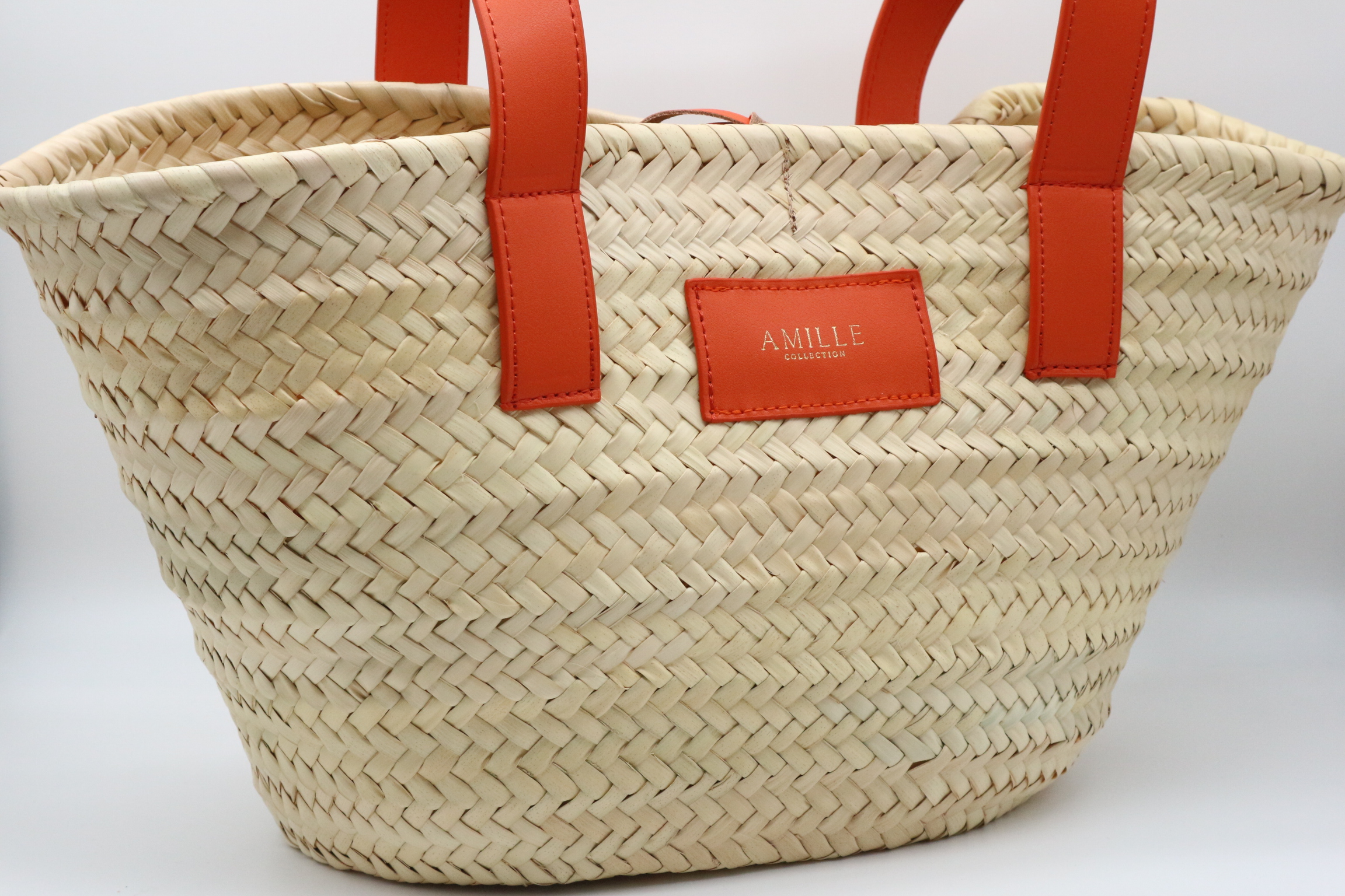 Capazo de palma combinado con piel de vacuno color naranja.