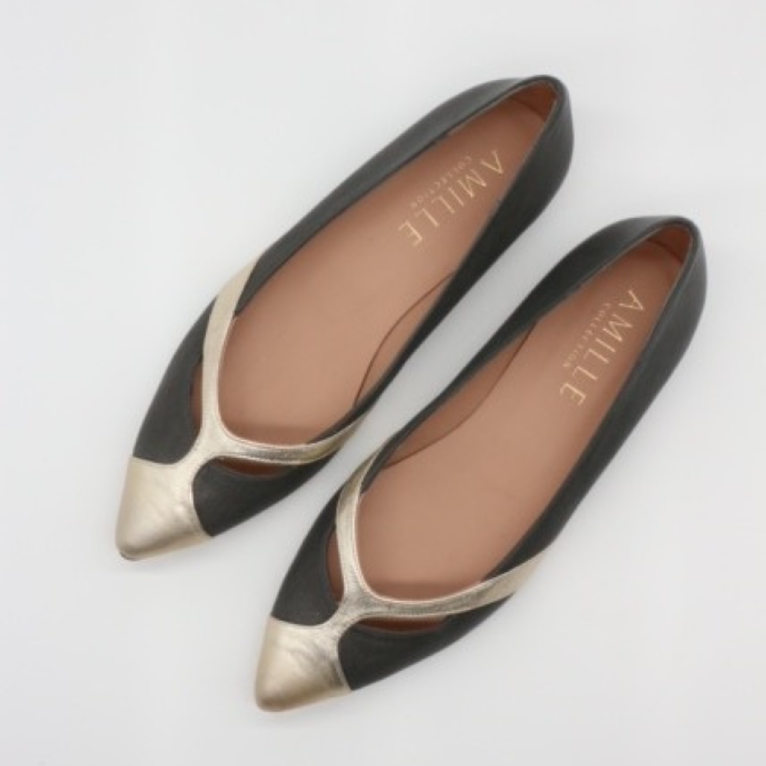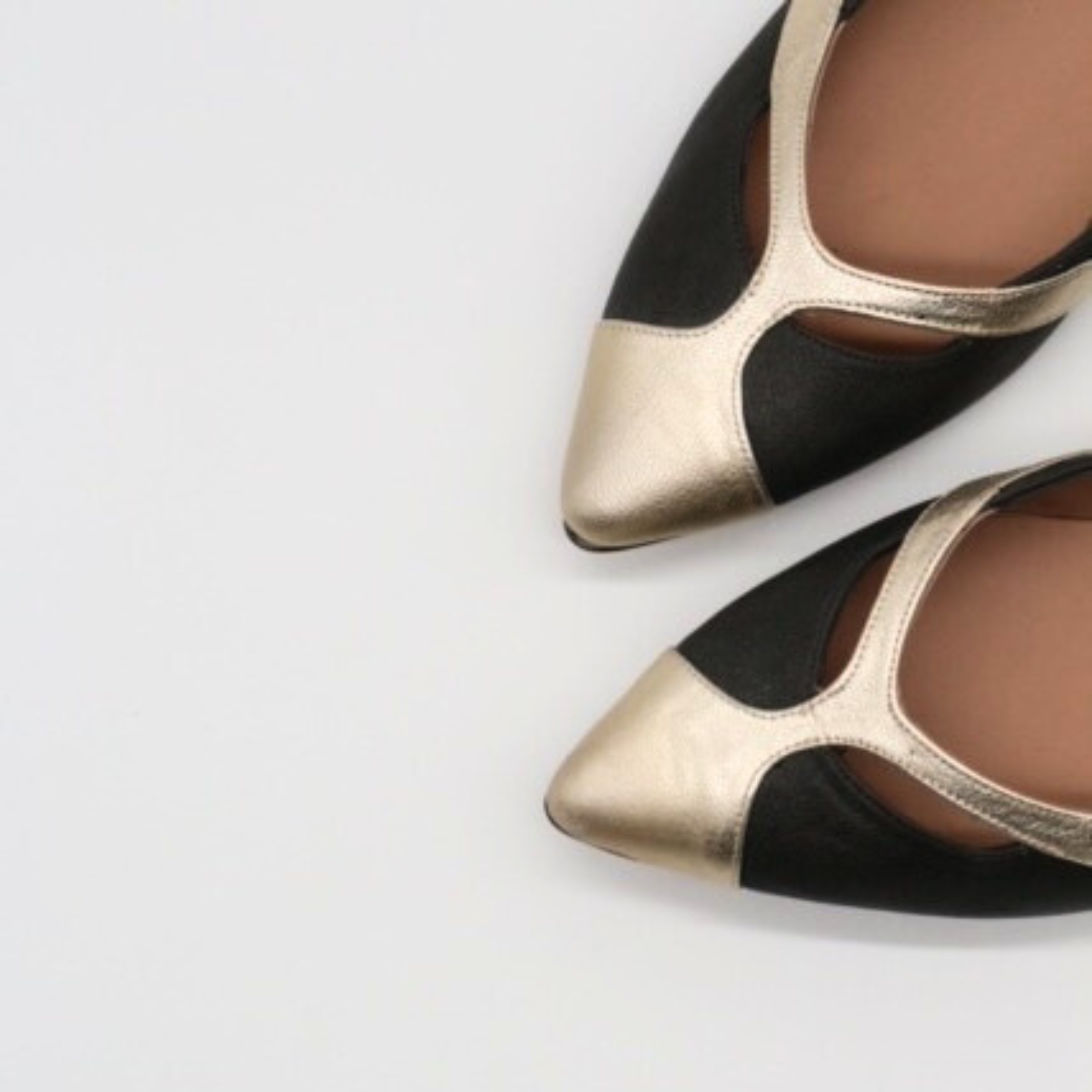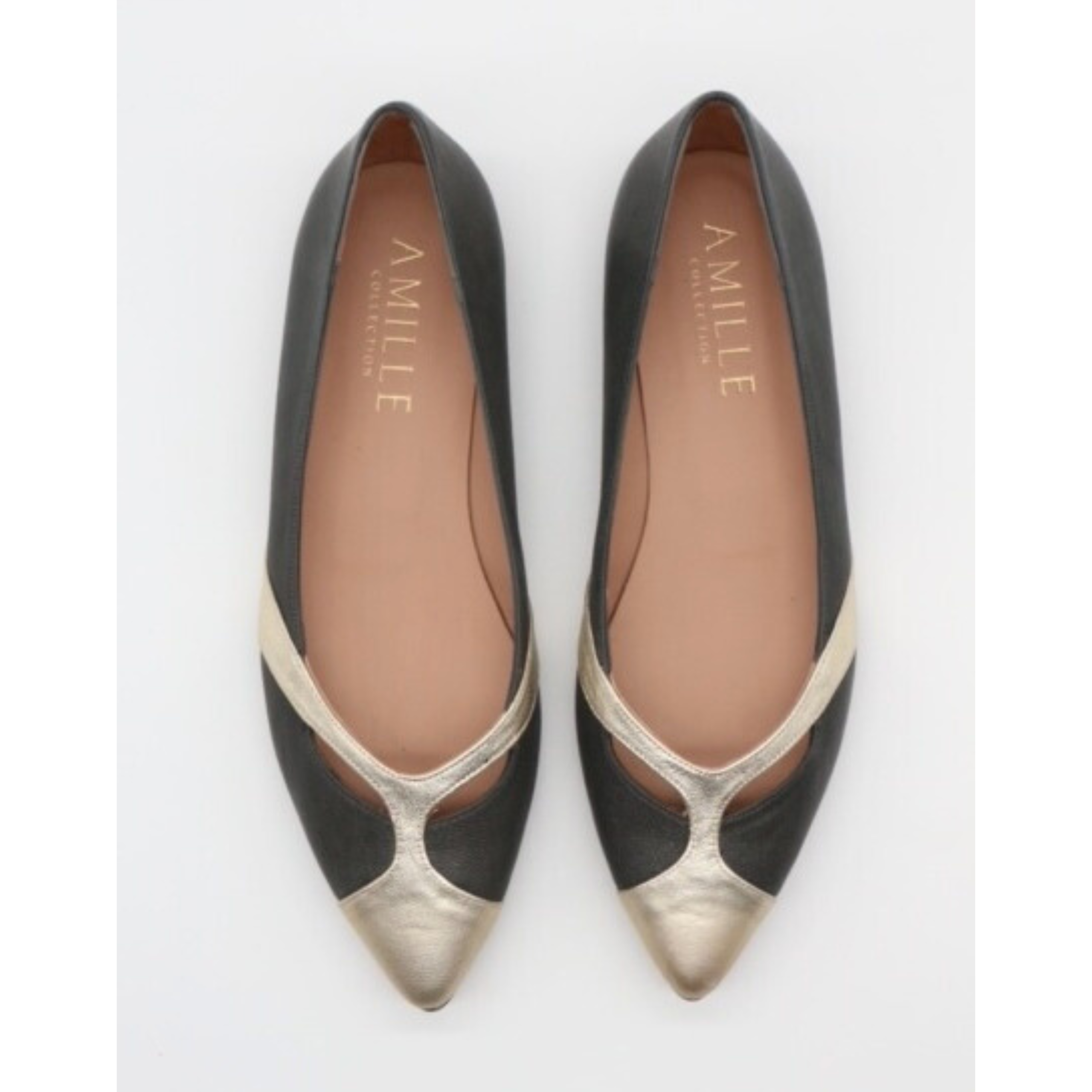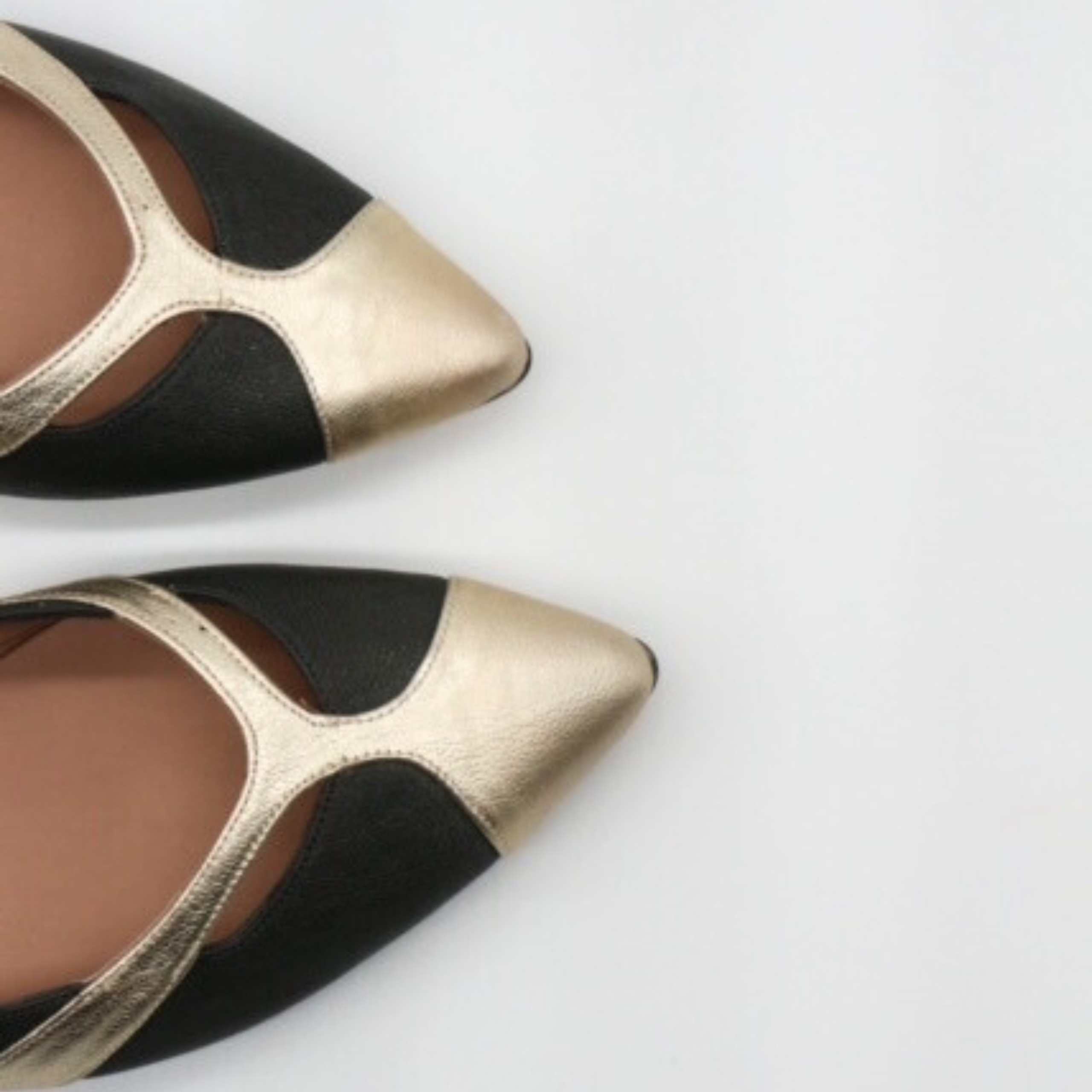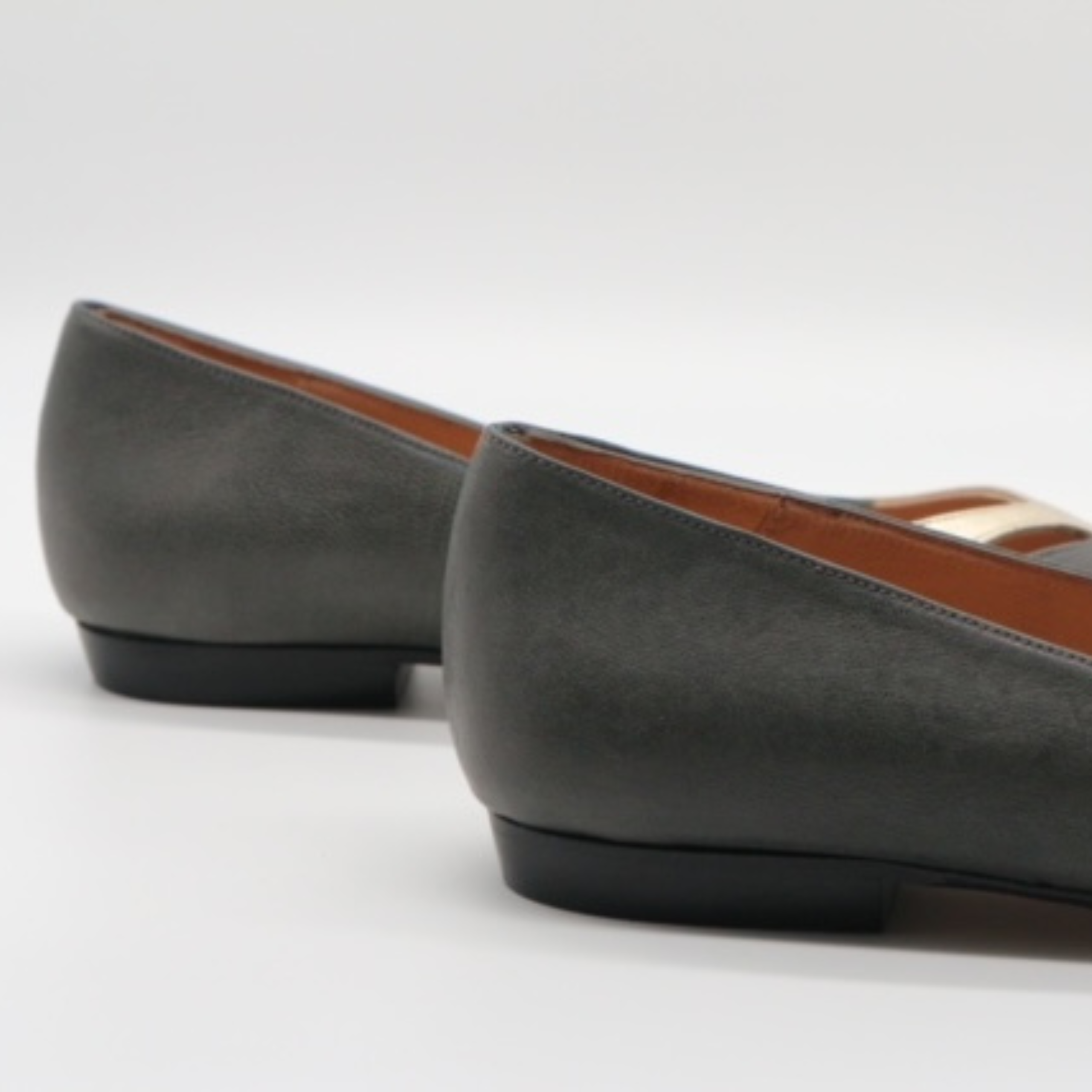 Bailarina de piel gris y puntera y tiras de piel de color dorado claro