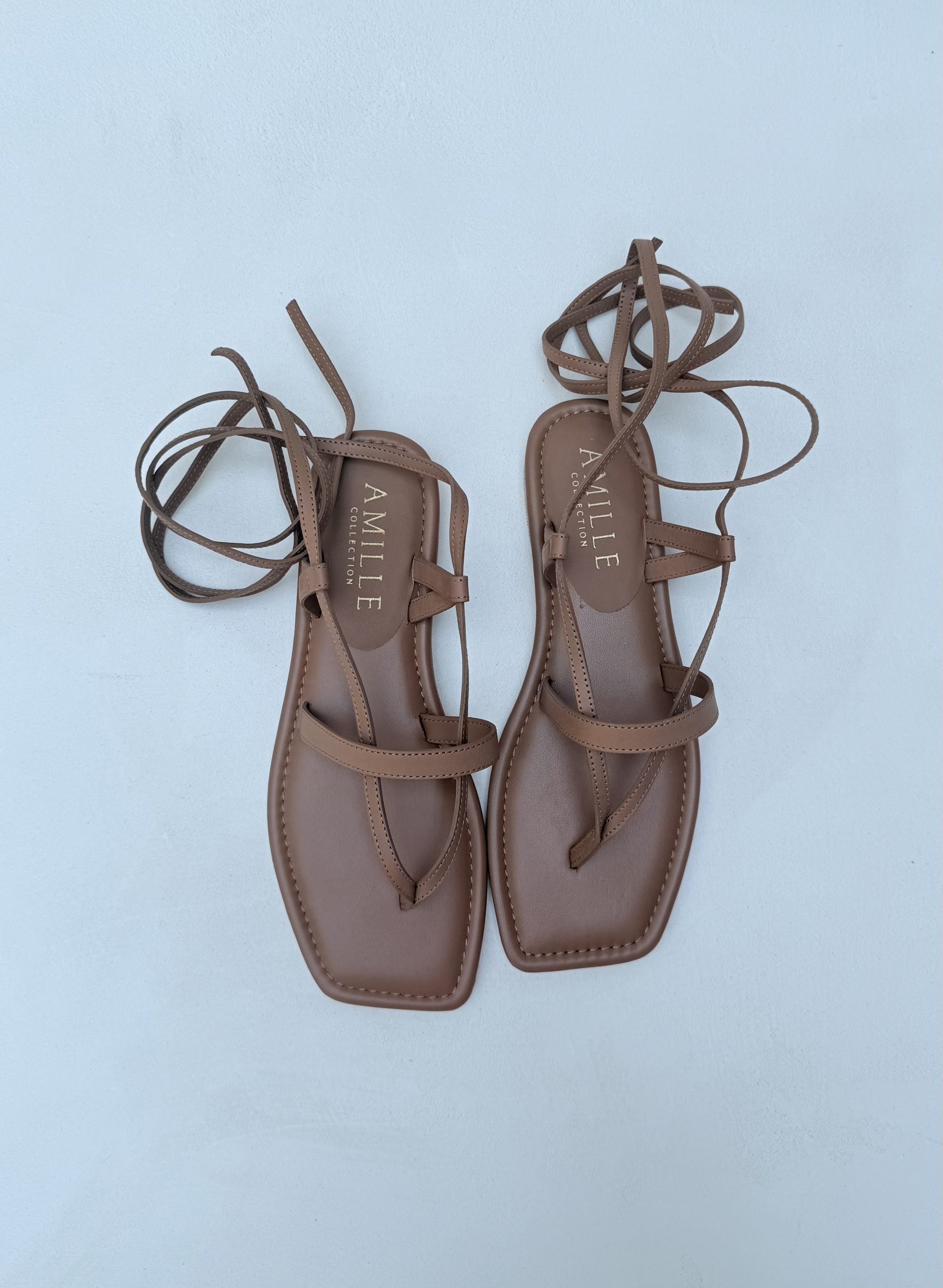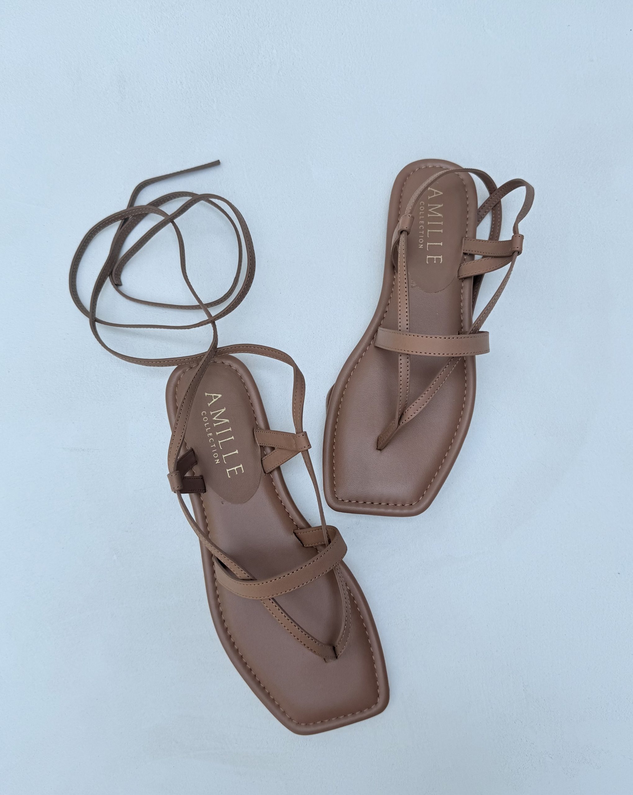 Sandalias romanas de piel color cuero con tiras que se atan al tobillo
