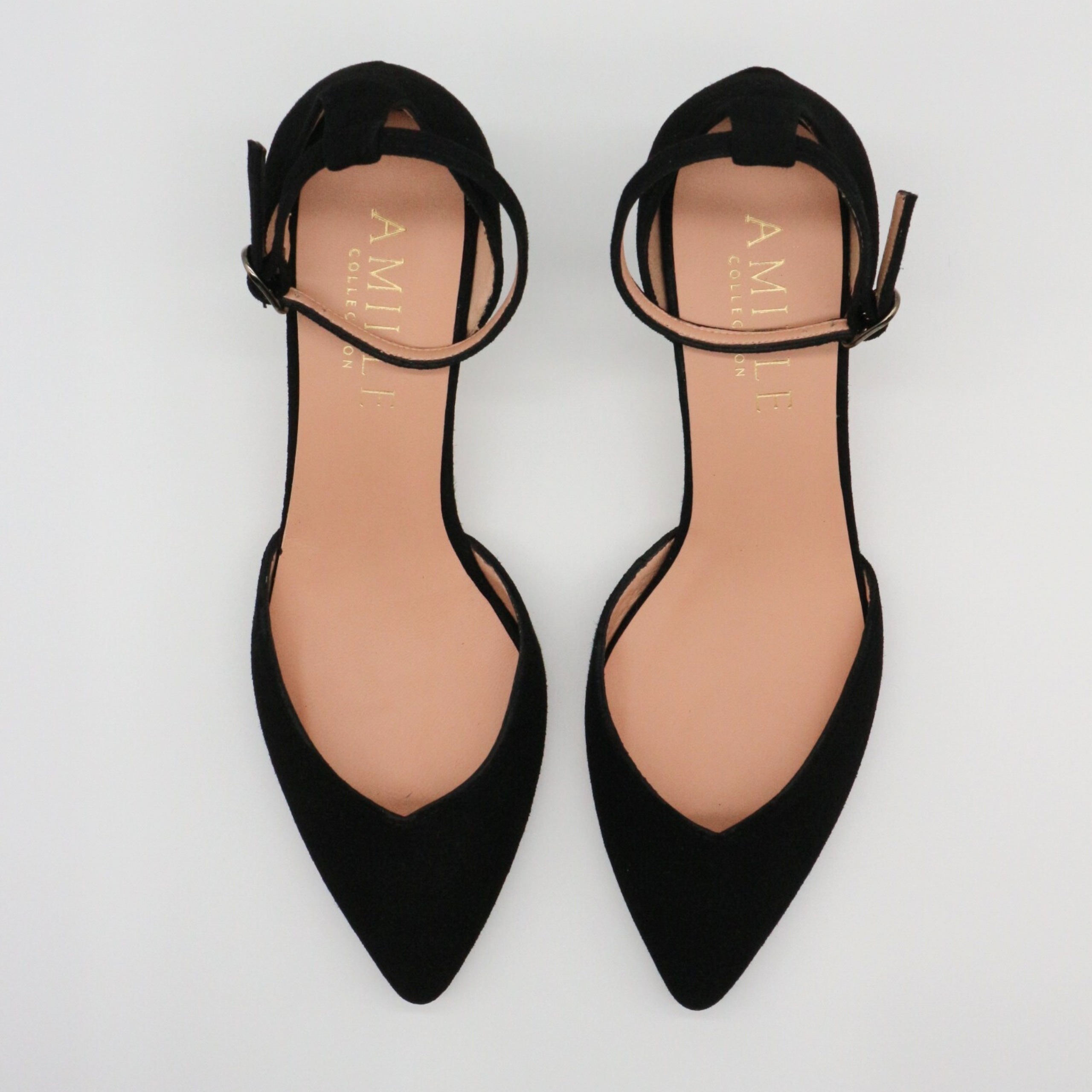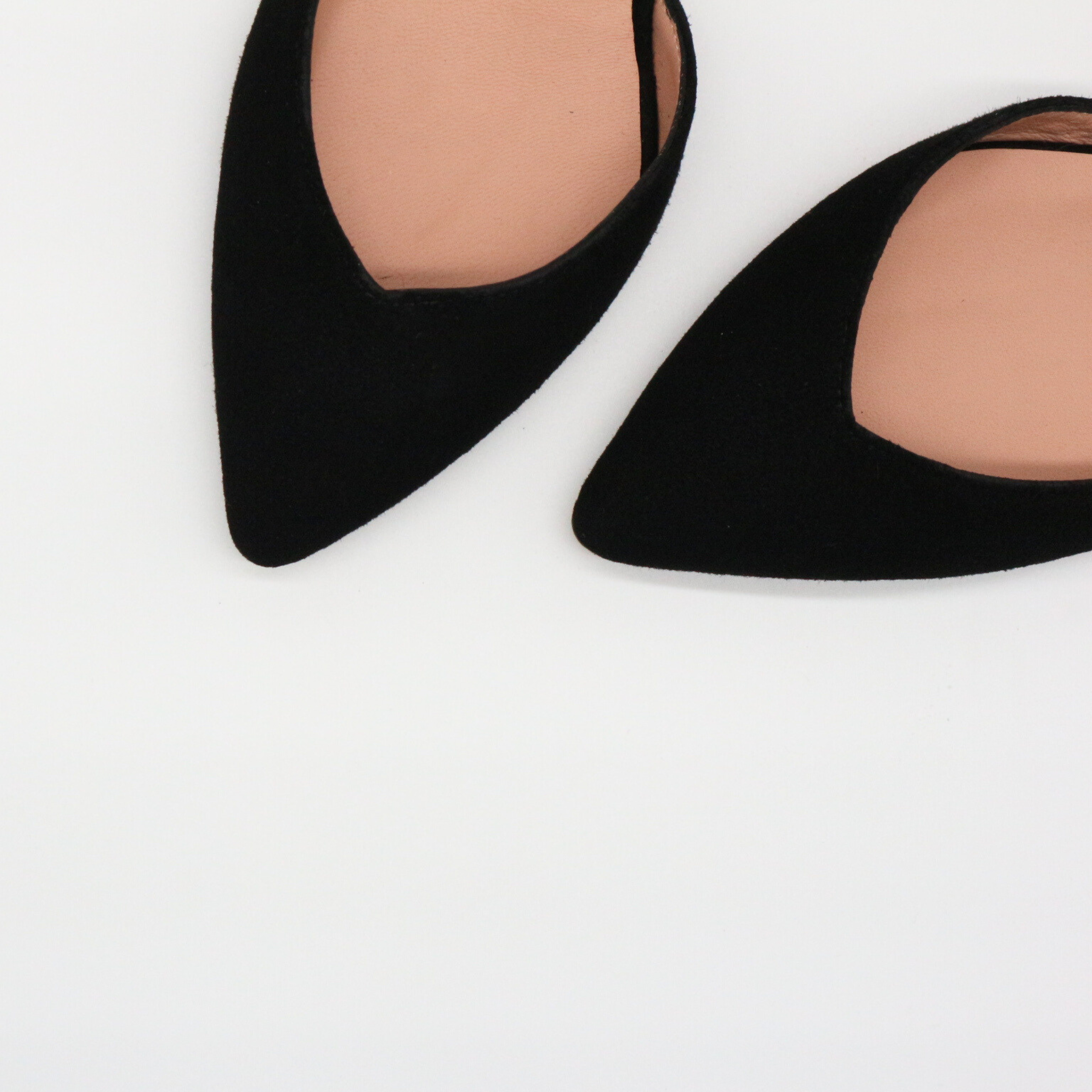Zapato de ante suave color negro , y pulsera con hebilla al tobillo.