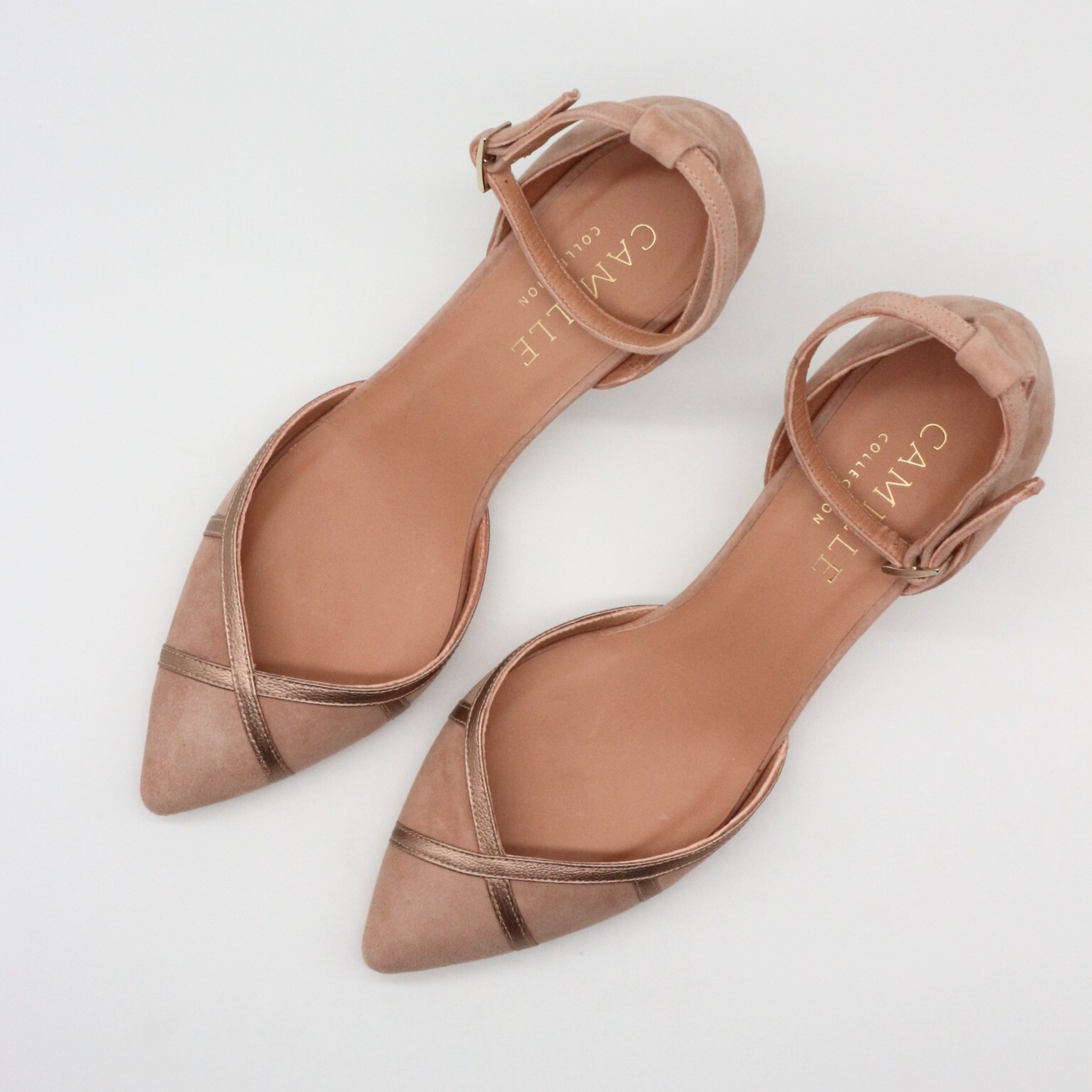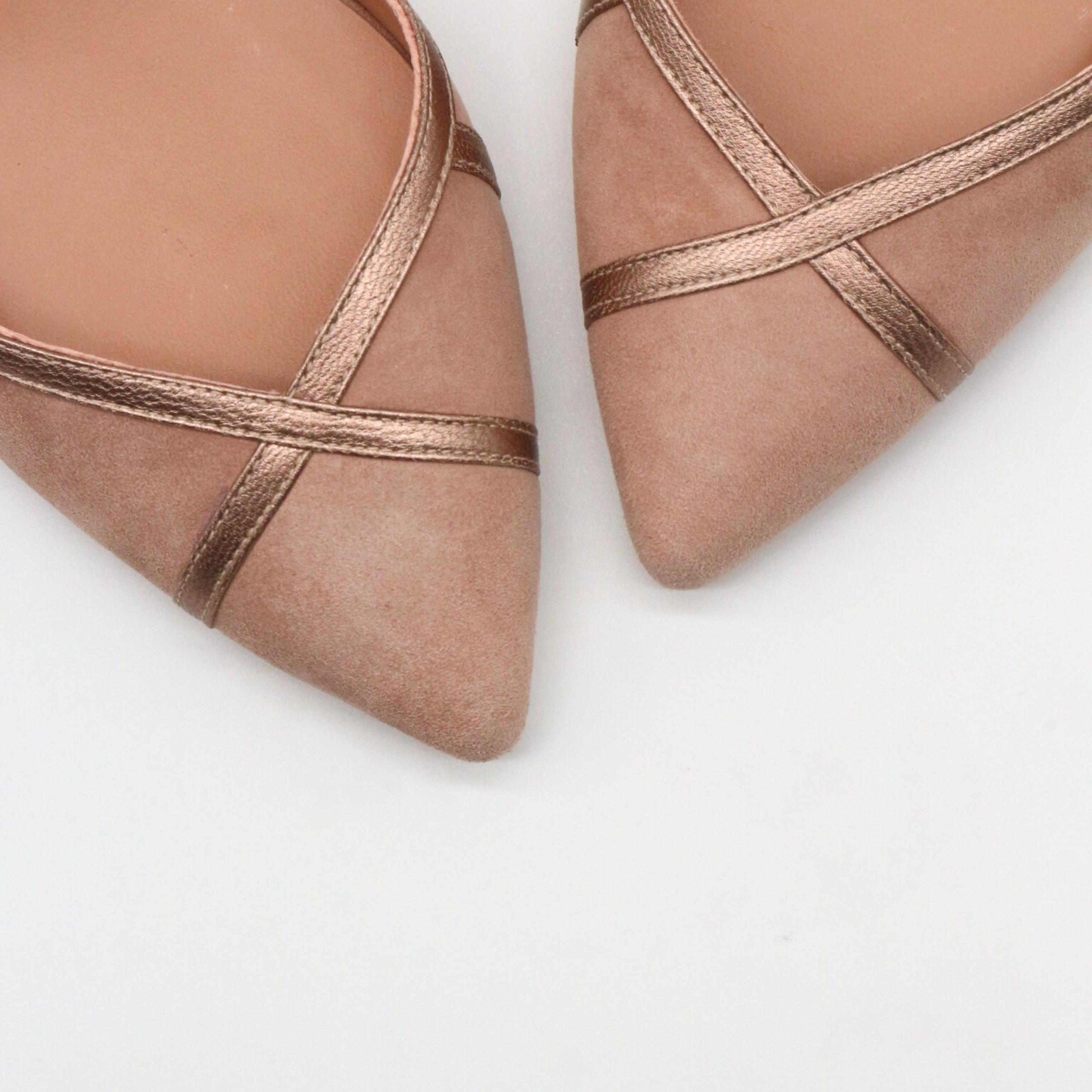 Zapato de ante suave color maquillaje , tiras en el mismo tono metalizado y pulsera con hebilla al tobillo.
